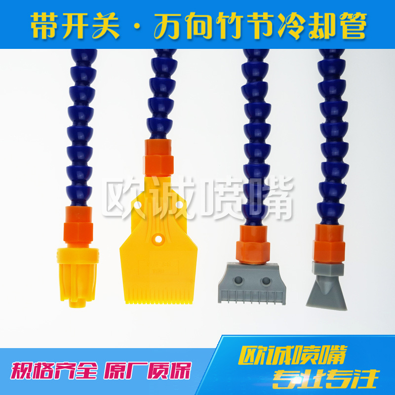 喷嘴是液体及气体媒质的综合引系统,压强可以达到4pa,它是用高质量的工程塑料制作而成,它的各个节使用精密的注塑工艺制成,其各节点连接接触曲面经过精确的计算并使用很高的注塑技术制造而成。因此可调塑料冷却管无需加任何导管,仅告自身接触曲面即可有极好的密封性。其接触面的紧密配合足以保证在高压水的冲击作用下,冷却水管始终保持其初始位置不变。因此,可调塑料冷却管为真正意义上的模块式结构,不但可根据需要任意增加或减少节数,并且可以在各节间根据需要加装开关,且有不同的连接与出水。
