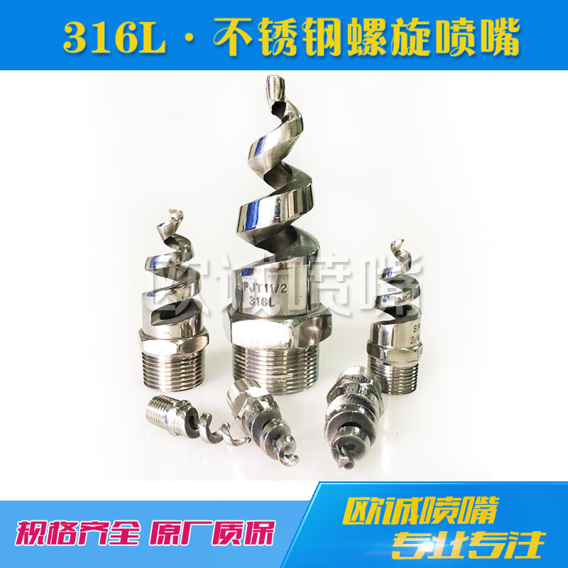 螺旋喷嘴设计紧凑,可使液体在给定的尺寸的管道上达到最大流量,由于具有畅通的通道设计,因而最大程度减少了喷嘴的阻塞现象;这种喷嘴可在绝大多数管道系统上安装和更新。螺旋喷嘴具有从1/4-4英寸的喷嘴外螺纹尺寸,适合大多数常见的管道,并具有多种流量和喷射角度可供选择,以满足各种需求。用户有特殊要求时可以提供内螺纹或法兰式接口。螺旋喷嘴可选用黄铜Brass、303/304/316不锈钢,PP塑料,TEFLON特氟纶,PVDF聚偏氟乙稀,碳化硅,陶瓷等材料精细加工而成,以满足多样化的应用需求。螺旋喷嘴已广泛应用于环保领域,诸如废气脱硫、除尘、气体洗涤和冷却等应用。压力更大时需用不锈钢材质喷嘴。