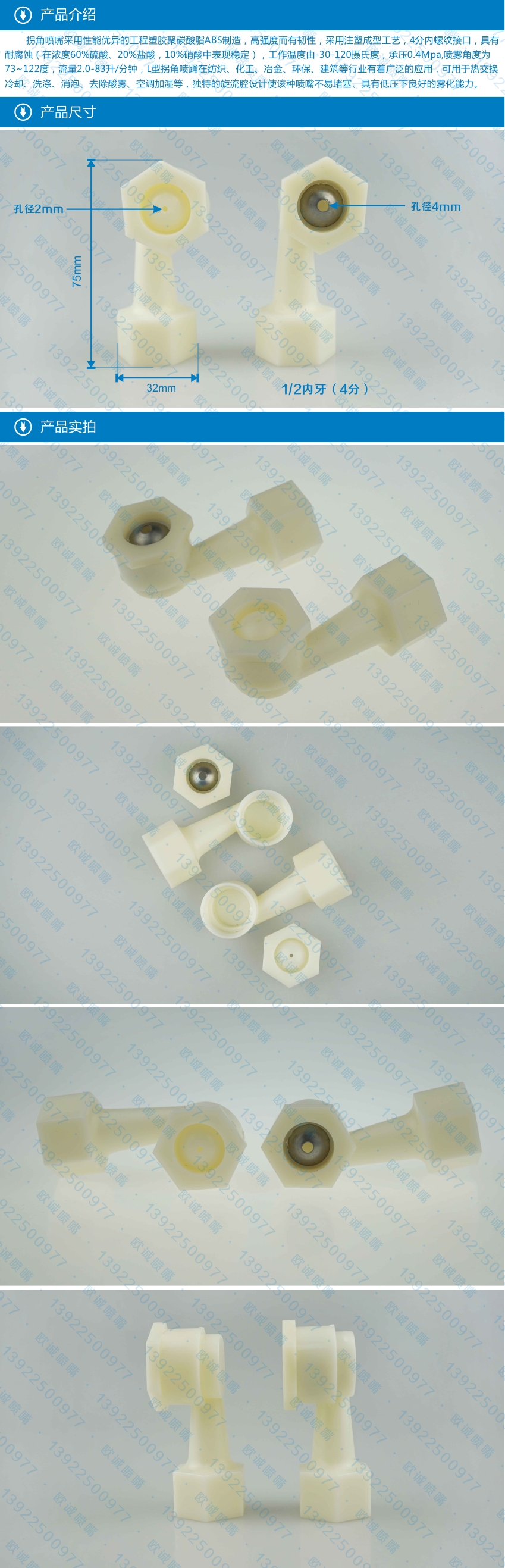 拐角喷嘴采用性能优异的工程塑胶聚碳酸脂ABS制造,高强度而有韧性,采用注塑成型工艺,4分内螺纹接口,具有耐腐蚀(在浓度60%硫酸、20%盐酸,10%硝酸中表现稳定),工作温度由-30-1