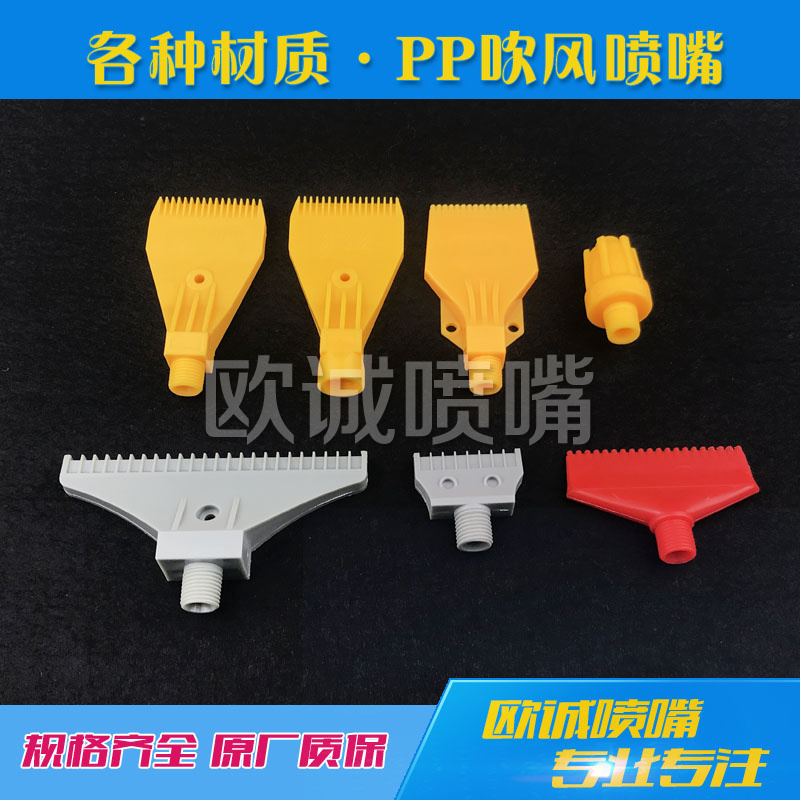 吹风喷嘴一般提供ABS塑料,铝合金或不锈钢材质。塑料吹风喷嘴能承受的气压为7巴,在此气压下耐温可达77℃。铝合金吹风型喷嘴能承受30巴左右气压并能耐250℃高温。