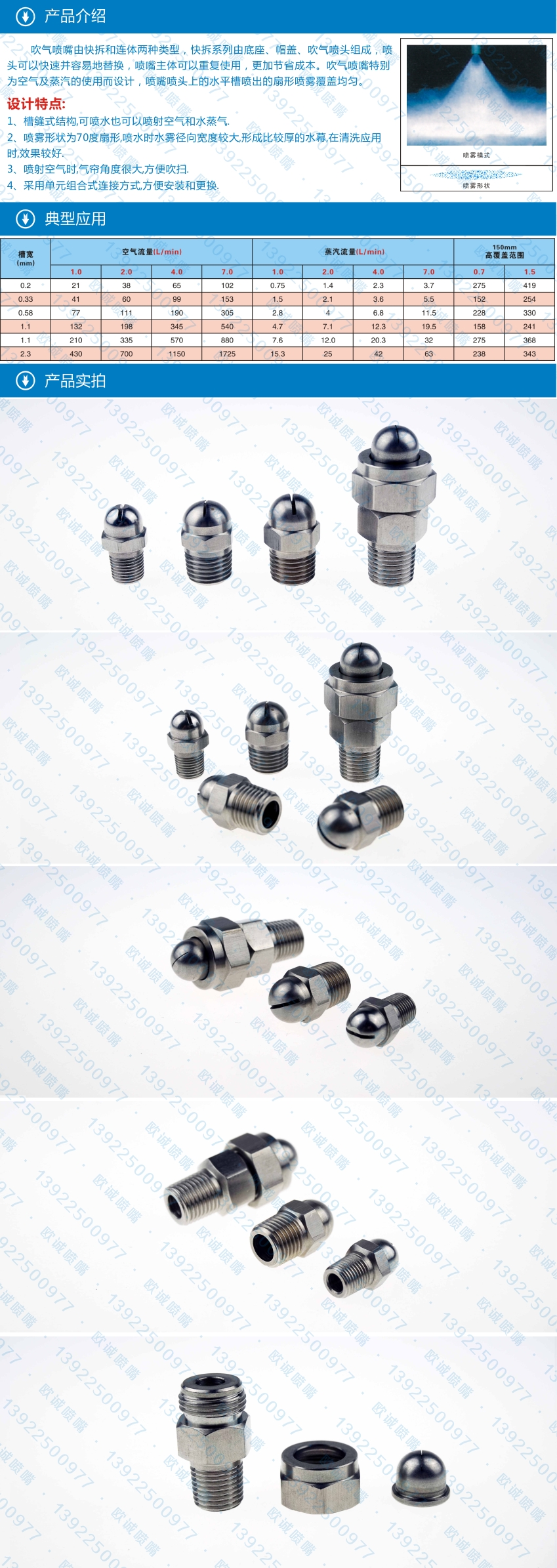 吹气喷嘴由快拆和连体两种类型,快拆系列由底座、帽盖、吹气喷头组成,喷头可以快速并容易地替换,喷嘴主体可以重复使用,更加节省成本。吹气喷嘴特别为空气及蒸汽的使用而设计,